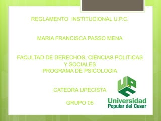 El documento define el reglamento institucional como el documento normativo que establece las normas y procedimientos de una universidad. Explica que el reglamento cubre aspectos académicos como admisiones y titulación, así como aspectos institucionales como planificación y sanciones disciplinarias. También describe algunos casos en los que los estudiantes deben referirse al reglamento, como para apelar una sanción o cuando un profesor asigna una nota incorrecta.