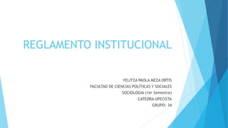 El documento presenta el reglamento institucional de la Universidad Popular del Cesar. Explica que el reglamento establece normas para regular las actividades de los estudiantes y promover la convivencia. Incluye secciones sobre la importancia de conocer y aplicar el reglamento, los derechos y deberes de los estudiantes, y los procedimientos a seguir en casos de fraude académico, agresiones físicas y cambios de carrera.