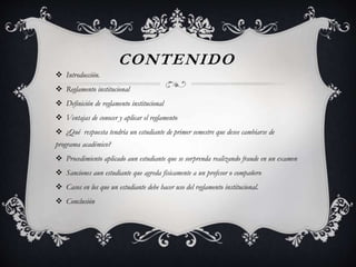 Este documento resume el reglamento estudiantil de la UPC. Explica que el reglamento establece los deberes y derechos de la comunidad estudiantil y cómo debe comportarse. Detalla algunas ventajas de conocer el reglamento como generar buena convivencia. Incluye ejemplos de cómo se aplica el reglamento, como no permitir cambios de programa al primer semestre o cancelar la matrícula por fraude.