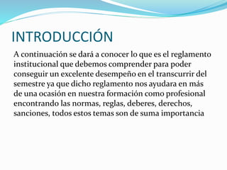 El documento explica la importancia del reglamento institucional de la Universidad Popular del Cesar para guiar a los estudiantes y darles pautas sobre sus deberes, derechos y sobre cómo comportarse en diferentes situaciones que se presentan durante sus estudios. Incluye definiciones de reglamento institucional y explica cómo este establece normas y procedimientos. También presenta algunos casos específicos sobre cambio de carrera, fraude académico, agresión y diferidos, citando los artículos correspondientes del reglamento. Concluye resalt