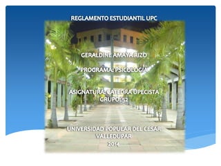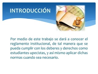 El documento explica el reglamento institucional de una universidad, incluyendo definiciones, puntos de vista de estudiantes sobre qué es un reglamento, y ventajas de conocerlo y aplicarlo. Explica procedimientos ante fraudes en exámenes, sanciones por agresión, y situaciones en las que los estudiantes deben usar el reglamento, como para cambiar de carrera o pedir una segunda calificación. El reglamento ayuda a resolver inquietudes de los estudiantes y orientarlos a tener buenas relaciones en la universidad.