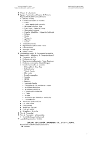 Este documento presenta el reglamento interno de la Institución Educativa "Coronel Gregorio Albarracín" de Tacna, Perú. Describe la creación y fines de la escuela, su estructura organizativa que incluye órganos de dirección, asesoramiento, gestión pedagógica y administrativa, y las funciones de sus diferentes departamentos y personal. Además, establece las normas y procedimientos relacionados con la gestión educativa, administrativa y de los estudiantes.