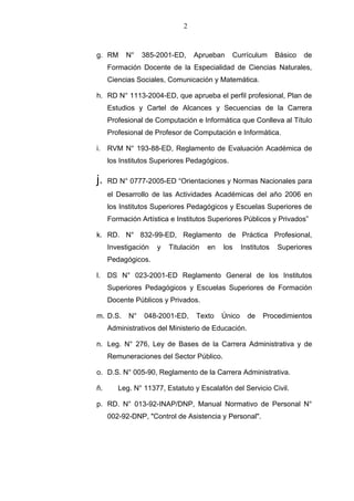 Este documento presenta el capítulo 1 y parte del capítulo 2 del reglamento interno de un Instituto Superior Pedagógico en Perú. Establece que el instituto depende del Ministerio de Educación y su ámbito de influencia es la provincia de Santa Cruz. También enumera las leyes y decretos que constituyen la base legal del reglamento y describe la estructura organizativa del instituto.
