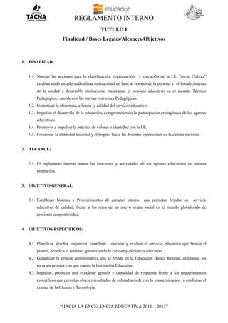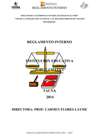 Este documento establece el reglamento interno de la Institución Educativa "Jorge Chávez" en Tacna para el año 2014. Define la finalidad, bases legales y estructura organizativa de la institución, incluyendo las funciones del director y otros cargos. Su objetivo es normar las acciones educativas para brindar un servicio de calidad y mejorar continuamente.
