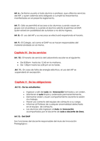 Este documento presenta el reglamento del Aula de Innovación Pedagógica de la I.E. 046 Libertadores de Ayacucho para regular el uso de sus servicios y recursos tecnológicos. Establece las funciones y responsabilidades del docente coordinador del aula, los derechos y obligaciones de los estudiantes y docentes usuarios, así como las normas y sanciones aplicables.
