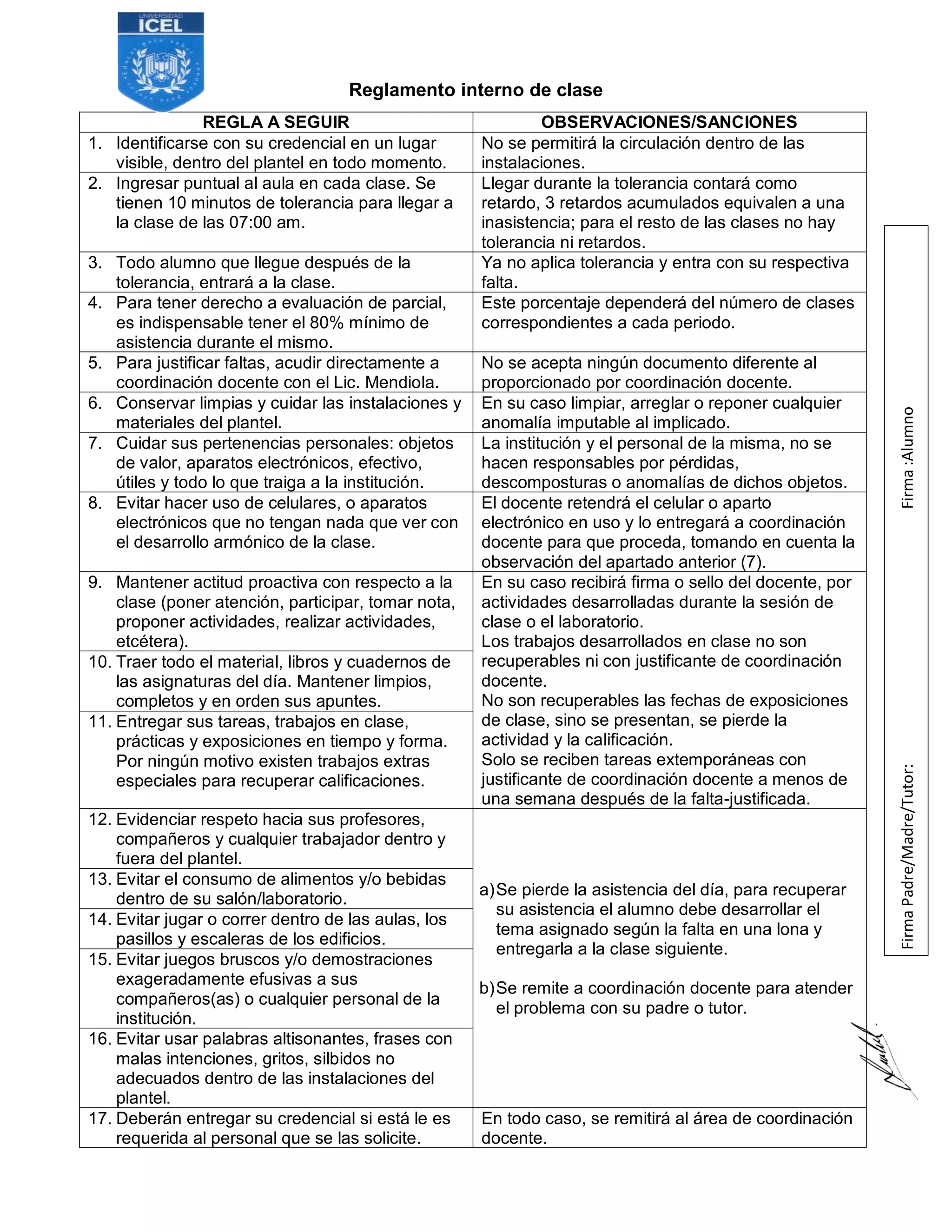 Este documento presenta las reglas y regulaciones internas que deben seguir los estudiantes. Incluye 21 reglas sobre temas como identificación, puntualidad, asistencia, justificación de faltas, comportamiento, tareas, y vestimenta. También describe las sanciones por incumplimiento como pérdida de asistencia, remisión a coordinación docente, o retención de objetos personales. Por último, explica los porcentajes de evaluación para cada periodo y los requisitos mínimos para aprobar la asignatura.