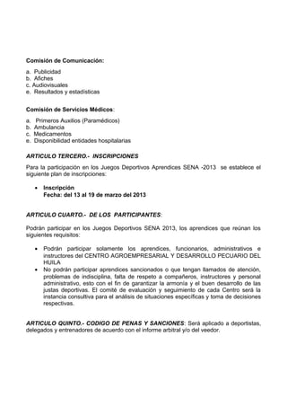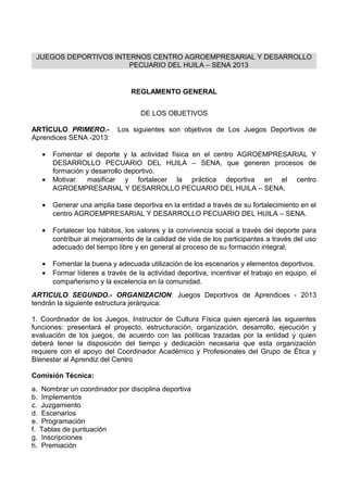 Este documento presenta el reglamento general para los Juegos Deportivos Internos del Centro Agroempresarial y Desarrollo Pecuario del Huila - SENA 2013. Los objetivos de los juegos son fomentar el deporte, motivar la práctica deportiva, fortalecer valores a través del deporte y formar líderes. Se establecen las comisiones organizativas, las inscripciones, los participantes permitidos, códigos de penas y sanciones por faltas deportivas, y normas para diferentes deportes incluyendo fútbol