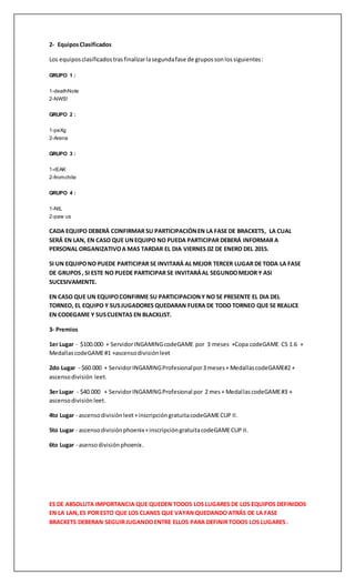 Este documento presenta el reglamento para el torneo LAN Counter-Strike 1.6 CodeGame Cup I. Detalla las reglas de inscripción de jugadores, los equipos clasificados, el formato de brackets, los premios y las modalidades y reglas de los encuentros. Se jugará en formato de torneo LAN el 10 de enero en Teracyber con 8 equipos participantes y se definirán los 6 primeros puestos.