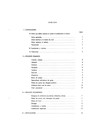 El documento establece normas y especificaciones técnicas para la construcción de instalaciones sanitarias domiciliarias e industriales, incluyendo requisitos para planos, desagües primarios y secundarios, provisión de agua fría y caliente, y detalles sobre instalaciones especiales. También detalla las tolerancias y características estructurales como ángulos y materiales a utilizar, así como la presentación de planos y gráficos para asegurar la eficacia en el diseño y cumplimiento normativo. Se enfatiza la importancia de la accesibilidad y el mantenimiento de las instalaciones a través de cámaras de inspección y regulaciones sobre desagües.