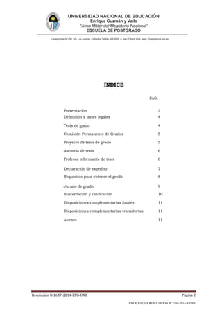 Este documento presenta el reglamento para obtener los grados académicos de magíster y doctor en la Escuela de Postgrado de la Universidad Nacional de Educación. Describe los requisitos y procedimientos para la elaboración y aprobación del proyecto de tesis, la designación de asesores y jurados, y la sustentación final. El objetivo es normar el proceso de obtención de grados de posgrado y contribuir a la solución de problemas educativos a través de la investigación.