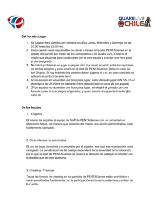 Este documento presenta las reglas para un torneo de CTF en Quake Live. Los equipos estarán compuestos de 5 jugadores incluyendo 4 titulares y 1 suplente. Los equipos se formarán una vez cerrada la inscripción y jugarán 3 partidos por semana en días y horarios establecidos. Los mapas a jugar serán seleccionados por los capitanes de cada equipo y se aplicarán sanciones por trampas o conductas inadecuadas.