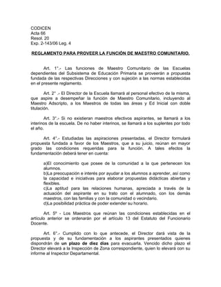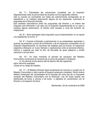 Este documento establece las regulaciones para proveer el rol de Maestro Comunitario en las escuelas primarias. Se dará prioridad a los maestros efectivos de la escuela que aspiren al rol. Si no hay aspirantes efectivos, se considerará a maestros interinos o suplentes. El director de la escuela propondrá a los maestros que reúnan mejor las calificaciones requeridas, tomando en cuenta su conocimiento de la comunidad, interés en ayudar a los estudiantes, habilidades interpersonales y disponibilidad de tiempo. La propuesta del