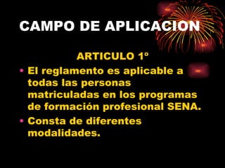 Este documento establece el campo de aplicación del reglamento del Servicio Nacional de Aprendizaje (SENA) de Colombia. Aplica a todas las personas matriculadas en los programas de formación profesional del SENA, independientemente de la modalidad de formación. También cubre proyectos desarrollados en sedes de tecnoparque o tecnoacademia, así como ambientes virtuales y aprendizaje en línea.