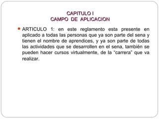 Este documento presenta el reglamento para aprendices del SENA (Servicio Nacional de Aprendizaje) de Colombia. Establece los derechos, deberes y procedimientos que deben seguir los aprendices. Incluye capítulos sobre el alcance del reglamento, derechos de los aprendices, deberes, etapas de práctica, trámites, faltas y sanciones. El reglamento busca garantizar una formación de calidad para los aprendices siguiendo principios de igualdad, responsabilidad y respeto.