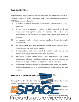 Este documento presenta las reglas para el Torneo Interdepartamental SPACE 2015. Establece las dimensiones de la cancha, los equipos participantes, el equipamiento requerido, la duración de los partidos, las faltas y tarjetas, y los procedimientos para lanzamientos, saques y cobros de faltas. El objetivo es fomentar la sana competencia y evitar agresiones, con un máximo de ocho jugadores por equipo excluyendo al portero.