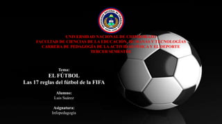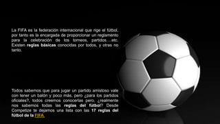 El documento describe las 17 reglas del fútbol de la FIFA, que son esenciales para la organización y ejecución de los partidos. Estas reglas incluyen aspectos como el terreno de juego, las características del balón, el número de jugadores, la equipación, el papel del árbitro, la duración del partido y las infracciones. Se cubren también las normativas sobre los tiros libres, penaltis, saques de banda, saques de meta y saques de esquina.