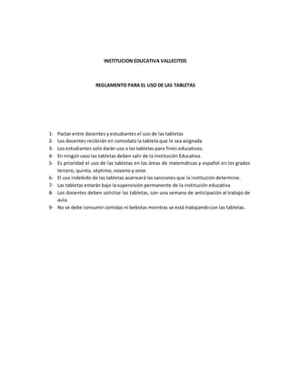 El reglamento establece que docentes y estudiantes deben pactar el uso de las tabletas asignadas por la Institución Educativa Vallecitos solo con fines educativos dentro de la institución. Asimismo, se prioriza el uso de las tabletas en las áreas de matemáticas y español en ciertos grados, y se establecen sanciones para un uso indebido de las tabletas que estarán bajo supervisión permanente de la institución.