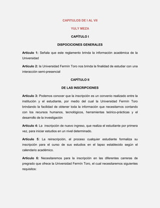 Este documento presenta el reglamento estudiantil de la Universidad Fermín Toro en Venezuela. Detalla los procesos de inscripción, reinscripción, equivalencias, reingreso y traslados. Para inscribirse, los estudiantes deben presentar documentos como el título de bachiller, notas certificadas, partida de nacimiento y fotografías. Las equivalencias determinan qué materias aprobadas en otras universidades son válidas. El reingreso permite a los estudiantes reincorporarse después de no cursar un lapso. Finalmente, los