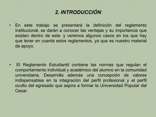 El documento habla sobre el reglamento institucional de una universidad. Explica que el reglamento establece las normas y procedimientos de la institución, y contiene las reglas que regulan el comportamiento de los estudiantes. También describe algunas ventajas de conocer y seguir el reglamento, como facilitar decisiones y fomentar el sentido de pertenencia. Además, explica posibles consecuencias de violar el reglamento, como ser expulsado por cometer fraude en un examen o agredir a otra persona.