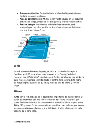El reglamento describe las dimensiones y líneas de la cancha de voleibol, incluyendo la red y sus alturas. Detalla las diferentes zonas de la cancha como la de ataque, saque y sustitución. Explica que los jugadores usan camiseta, short y zapatillas numeradas y que los partidos consisten en sets ganados al alcanzar 25 puntos con diferencia de 2 sobre el oponente.