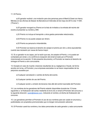 Este documento establece los términos y condiciones del concurso "Henry Méndez" organizado por Blogmusik SAS. Los participantes deben ser mayores de 18 años residentes en España e inscribirse en la página web del concurso entre el 10 y el 20 de mayo. Dos ganadores serán seleccionados al azar y recibirán una invitación para dos personas a un evento de Meet & Greet con Henry Méndez el 22 de mayo en Barcelona.