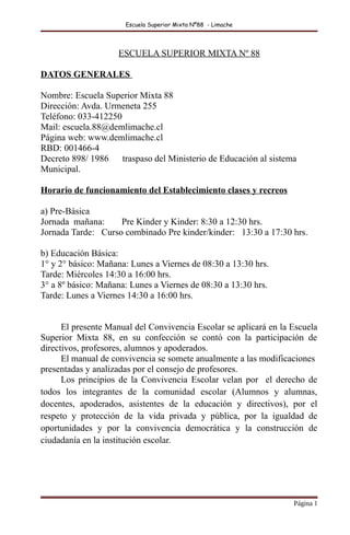 Este documento presenta información sobre la Escuela Superior Mixta No88 en Limache, Chile. Incluye datos generales de la escuela como su nombre, dirección y horarios. También presenta su reglamento de convivencia escolar, el cual establece normas y procedimientos para regular los deberes de los estudiantes. Define conceptos como maltrato escolar e incluye ejemplos de conductas prohibidas. Además, describe las medidas y sanciones disciplinarias que pueden aplicarse a quienes incumplan las normas de convivencia escolar.