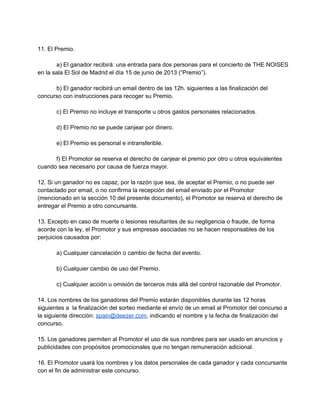 Este documento establece los términos y condiciones del concurso "THE NOISES" organizado por Blogmusik SAS. Los participantes deben ser mayores de 18 años residentes en España e inscribirse antes del 10 de junio en la página web del concurso. Dos ganadores serán seleccionados al azar y cada uno recibirá una entrada doble para el concierto de THE NOISES en Madrid el 15 de junio.