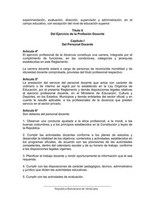 Este documento presenta el Reglamento del Ejercicio de la Profesión Docente en Venezuela. Establece normas sobre el ingreso, promoción, remuneración, licencias y jubilación del personal docente. Define la carrera docente y el escalafón por jerarquías y categorías. Además, detalla los deberes y derechos de los profesionales de la docencia.