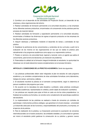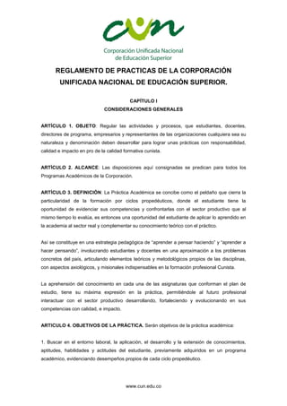 Este documento presenta el reglamento de prácticas de la Corporación Unificada Nacional de Educación Superior. Establece cinco modalidades de prácticas para estudiantes: contrato de aprendizaje, pasantía, validación de experiencia laboral, y asesoría y asistencia técnica. Detalla los requisitos, desarrollo e implementación de cada modalidad de práctica y el proceso de inscripción, seguimiento y calificación. El objetivo es regular las actividades de prácticas para lograr una formación con responsabilidad,