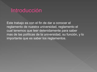 Este documento resume los principales puntos del reglamento de una universidad. Explica que el reglamento establece las obligaciones, deberes y derechos de los estudiantes y profesores, y formaliza la estructura organizativa de la universidad. También describe algunas ventajas de conocer el reglamento, como facilitar la toma de decisiones de los estudiantes y ayudar a resolver conflictos. Explica además los pasos para solicitar un traslado de programa y las posibles sanciones por cometer faltas contra el orden universitario.