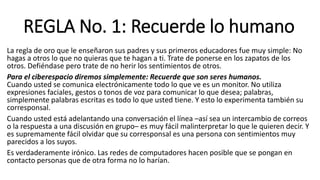 Este documento presenta 10 reglas básicas de la netiqueta. 1) Recuerde que hay personas reales detrás de las pantallas. 2) Siga los mismos estándares de comportamiento que en la vida real. 3) Asegúrese de conocer las normas de cada espacio online antes de participar.