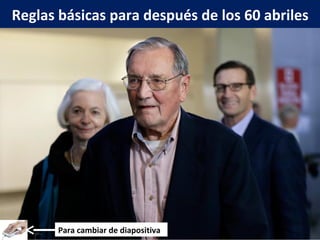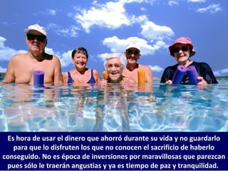 Este documento ofrece consejos para personas mayores de 60 años, recomendando que disfruten su dinero y tiempo libre en lugar de ahorrarlo o preocuparse por otros, mantengan una vida social activa aprendiendo cosas nuevas y saliendo de casa, y mantengan una actitud positiva aceptando la vida tal como es.