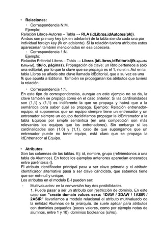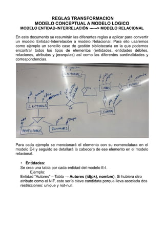 Este documento detalla las reglas para transformar un modelo entidad-interrelación (e-i) en un modelo relacional, usando un ejemplo de gestión bibliotecaria para ilustrar la conversión de entidades, relaciones y atributos. Se explican las tablas que se crean para entidades y relaciones, así como el tratamiento de atributos multivaluados, compuestos y jerárquicos. Asimismo, se abordan las entidades débiles y su correspondencia con las relaciones dentro del modelo.