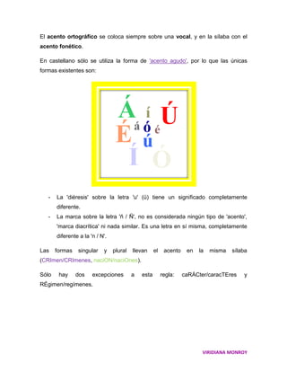 El documento clasifica las palabras en cuatro grupos según donde recae su acento fonético: agudas (última sílaba), graves o llanas (penúltima sílaba), esdrújulas (antepenúltima sílaba) y sobreesdrújulas (más atrás). Explica que el acento ortográfico siempre se coloca sobre una vocal y coincide con el acento fonético. También resume las reglas básicas de acentuación ortográfica para palabras agudas, graves y esdrújulas.