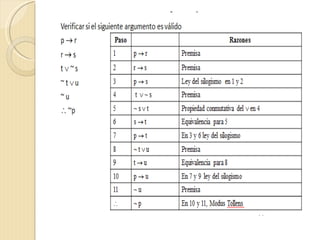 El documento describe las reglas de inferencia lógica de predicados como modus ponens, modus tollens, silogismo hipotético, silogismo disyuntivo, conjunción, simplificación, adición y dilema constructivo. También introduce la resolución como una técnica poderosa para probar teoremas en lógica que constituye la técnica básica de inferencia en PROLOG.