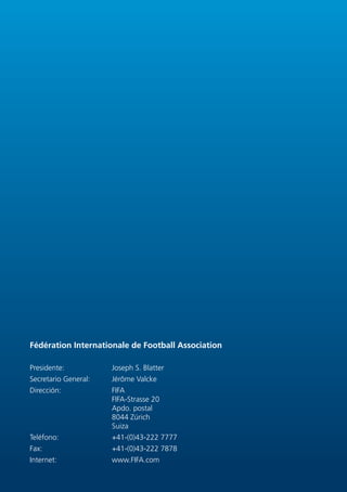 Este documento presenta las reglas de juego de fútbol para la temporada 2013/2014. Establece las dimensiones y marcas del terreno de juego, incluyendo el área de meta, área penal, círculo central y demás. También especifica las características de los postes de meta, banderines de esquina y balón que debe usarse. Además, presenta la estructura organizativa de la FIFA y el IFAB, que son los organismos rectores del fútbol a nivel mundial.