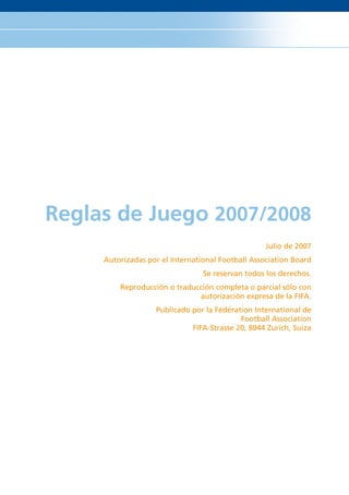 El documento describe las dimensiones y marcas reglamentarias de un terreno de juego de fútbol. Especifica las medidas del campo, el área de meta, el área penal, y las ubicaciones de las metas, líneas, círculos central y de penal. También detalla los requisitos de seguridad para los postes de meta y banderines de esquina.