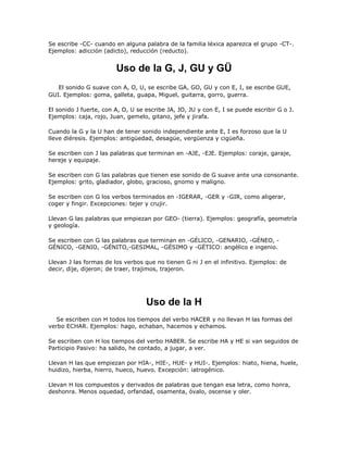 Este documento presenta reglas ortográficas sobre el uso de letras como B, V, W, C, Z, QU, K, G, J, GU, GÜ, H, Y, LL, M, N, R, S, X, acentos y mayúsculas. Explica cuándo se usan estas letras en palabras españolas y cómo afectan las reglas de acentuación y uso de mayúsculas y minúsculas.