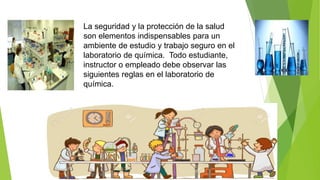 Este documento lista 21 reglas de seguridad que deben seguirse en el laboratorio de química para garantizar un ambiente de trabajo seguro. Entre las reglas se incluyen prohibir fumar o comer, usar gafas y zapatos cerrados, etiquetar reactivos correctamente, manejar materiales tóxicos dentro de campanas de extracción y usar guantes para corrosivos. También se enfatiza limpiar equipos, mantener orden y acceso despejado, y estar familiarizado con equipos de emergencia.