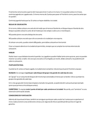 Este documento presenta las reglas para un juego de construcción de ciudades llamado Expansiopolís. Los jugadores cooperan para construir una ciudad colocando cartas con bloques de diferentes zonas (comercial, parque, industrial y residencial) siguiendo reglas como no superponer cartas y conectar bloques. Al final se cuentan puntos por los grupos más grandes de cada zona y por carreteras para ver si se alcanza la puntuación objetivo establecida al azar al inicio.