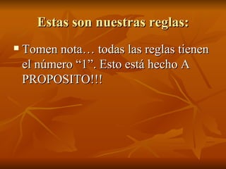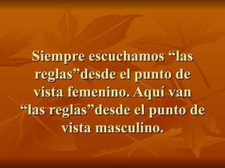 Este documento presenta "las reglas" desde la perspectiva masculina en forma de broma. Enumera varias reglas sobre temas como mirar el cuerpo de las mujeres, deportes los sábados, no entender indirectas, y opiniones sobre la ropa y apariencia de las mujeres. El documento sugiere que los hombres no necesitan direcciones y que dormir en el sofá no es un gran problema. Finalmente, pide que se comparta con hombres para reírse y con mujeres para educarlas.