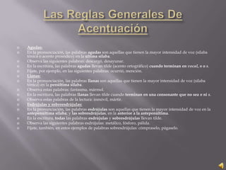 Este documento explica las reglas de acentuación ortográfica en español para palabras agudas, llanas, esdrújulas y sobresdrújulas. También cubre las reglas para palabras con diptongos, triptongos y hiatos, así como las excepciones para palabras monosílabas y las letras b y v. Finalmente, explica las reglas para la h.