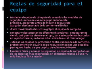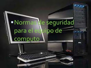 El documento presenta normas de seguridad para el equipo de computo, incluyendo trasladarlo solo cuando este apagado y desconectado, evitar golpes, conectar y desconectar dispositivos correctamente, usar protección contra variaciones de corriente, limpiarlo regularmente quitando polvo y suciedad, asegurarse que los ventiladores funcionen bien y seguir instrucciones para el encendido correcto. También recomienda reglas de seguridad para los usuarios como no ensuciar el teclado, comer lejos de la computadora y cuidar