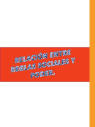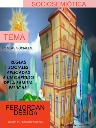 El documento resume las reglas sociales observadas en un capítulo de la serie de televisión "Familia Peluche". Algunas de las reglas sociales mostradas incluyen la obligación de saludar a las madres el Día de las Madres, estereotipos sobre las suegras, la autoridad incondicional de los padres sobre los hijos, el estatus asociado con ser un "Junior" en la universidad, la necesidad de celebrar a las madres el 10 de mayo y comprar regalos, la impaciencia de los conductores en el tráfico,