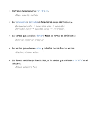 El documento resume las reglas ortográficas para el uso de la letra "v" en español. Indica que se usa la "v" en palabras que comienzan con prefijos como "vi-", en palabras que comienzan con sílabas como "di-", en adjetivos y determinantes que terminan en sufijos como "-ava", y en verbos que terminan en "-servar" u "-olver". También se usa la "v" detrás de consonantes como "b", "d" o "n", y en formas verbales derivadas de verbos sin "b" ni "v"
