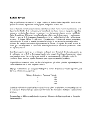 Vinci es un juego de estrategia en el que los jugadores controlan el ascenso y caída de diferentes civilizaciones a lo largo del tiempo. Cada civilización comienza pequeña pero se expande rápidamente para formar un gran imperio, hasta que inevitablemente entra en declive y el jugador elige una nueva civilización. El objetivo es acumular la mayor cantidad de puntos de victoria a través del control de provincias en el tablero de juego.