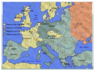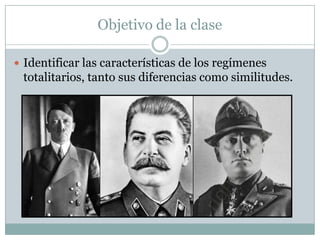 Este documento describe las características de los regímenes totalitarios, incluyendo el control absoluto del estado, la concentración del poder en un solo partido político y un líder carismático. Analiza los regímenes totalitarios de Stalin en la Unión Soviética, Mussolini en Italia, Hitler en Alemania Nazi y Franco en España, destacando su uso de la violencia, la propaganda y la supresión de la disidencia.