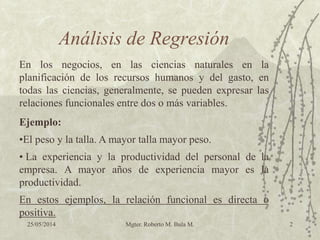 Este documento presenta una introducción al análisis de regresión. Explica que el análisis de regresión permite cuantificar la relación entre una variable dependiente y una o más variables independientes a través de una función matemática. Describe los objetivos del análisis de regresión, que son determinar la asociación entre las variables y predecir los valores de una variable en base a la otra. También introduce conceptos clave como el diagrama de dispersión, los coeficientes de la ecuación de regresión, el coeficiente de correlación y el coeficiente de