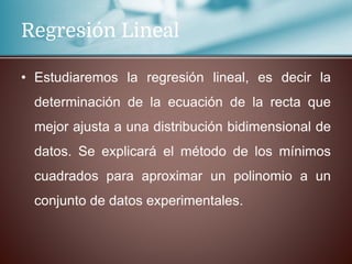 Este documento trata sobre la regresión lineal. Explica que se estudiará el método de mínimos cuadrados para aproximar un polinomio a un conjunto de datos experimentales. Aborda las distribuciones bidimensionales donde se disponen los datos experimentales en dos columnas con la abscisa x y su ordenada y para investigar cómo una variable influye en la otra. Como ejemplo, menciona que la cantidad de lluvia puede dar lugar a un aumento de la producción agrícola.