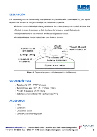 Las válvulas reguladoras de Blanketing se utilizan para regular la presión de nitrógeno en tanques inertizados con nitrógeno. Mantienen la presión a niveles adecuados para evitar la corrosión, explosión y degradación dentro del tanque. Funcionan cerrando y abriendo un asiento para dejar pasar nitrógeno cuando la presión baja y cerrarlo cuando alcanza el nivel deseado.